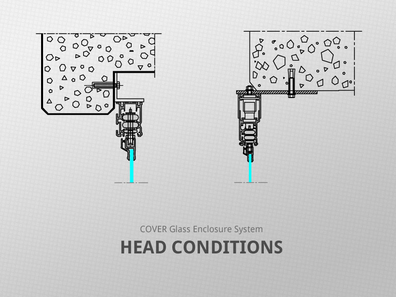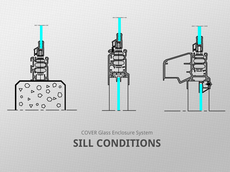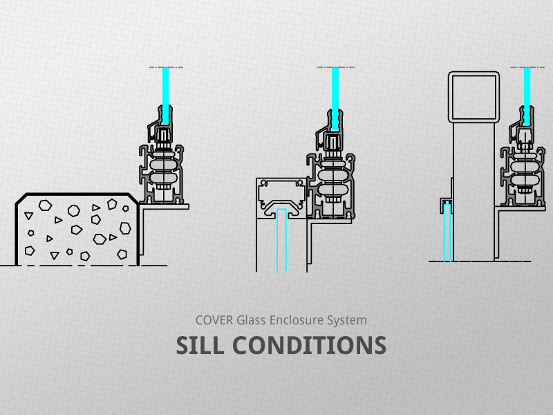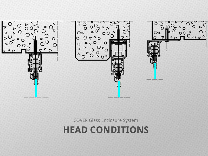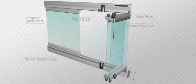 COVER Glass Enclosure System consists of specially designed glass panels suspended between upper and lower steering profiles. Each individual glass panel can slide freely in both directions. Glass panels can easily slide around corners, regardless of the angle. The system is both top hung and bottom supported, with 75% of panel weight carried by the top track.