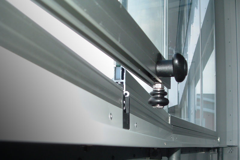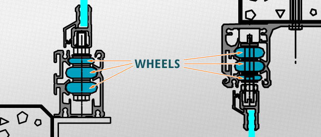 Each glass panel is installed with four specially designed wheel units that require little to no maintenance for most installations. The wheel units operate within head and sill track components used for panel operation. They consist of heat resistant polymer wheels with stainless steel ball bearing action to ensure effortless and silent horizontal sliding. The POM injection molded wheels, under random profile testing, were undamaged at loads exceeding 1,320 lbs; tensile strength of their gearing axle exceeded 3.560 lbs per axle.